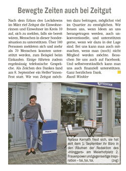 Nach dem Erlass des Lockdowns im März rief Zeitgut die Einwohnerinnen und Einwohner im Kreis 10 auf, sich zu melden, falls sie bereit wären, Menschen in dieser Sondersituation zu unterstützen. Über 140 Personen meldeten sich und mehr als 70 Menschen konnten unterstützt werden, zum Beispiel beim Einkaufen. Einige führten zudem regelmässig telefonische Gespräche. Als Zeichen des Dankes fand am 8. September ein Helfer*innen- Fest statt. Wir von Zeitgut möchten dazu beitragen, möglichst viel im Quartier zu ermöglichen. Wir freuen uns, wenn Ideen an uns herangetragen werden, auch unkonventionelle, und unterstützen gerne, wenn wir dazu in der Lage sind. Bei uns kann man auch mitmachen, wenn man (noch) nicht Mitglied werden möchte. Besuchen Sie uns auch auf Facebook. Und selbstverständlich kann man uns auch finanziell unterstützen. Ganz herzlichen Dank.